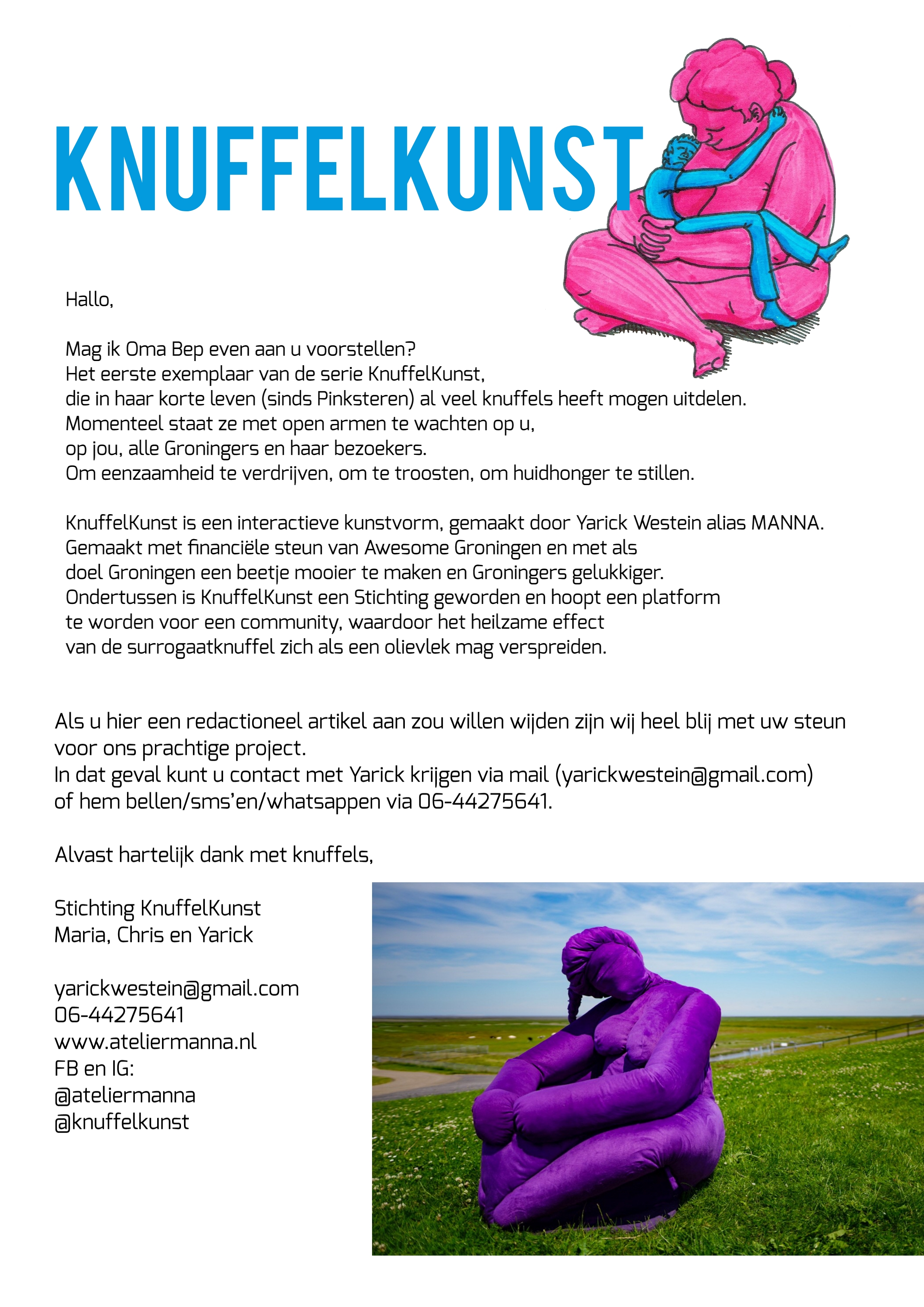 KnuffelKunst is een interactieve kunstvorm, gemaakt door Yarick Westein alias MANNA. Gemaakt met financiële steun van Awesome Groningen en met als doel Groningen een beetje mooier te maken en Groningers gelukkiger.